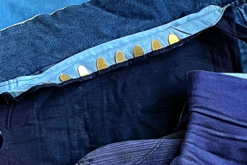 Par-dessus, on enfilait un tablier de poitrine (harakake), lui aussi en indigo, qui prenait de la patine avec le temps et l’usage, ajoutant une certaine profondeur à sa couleur.