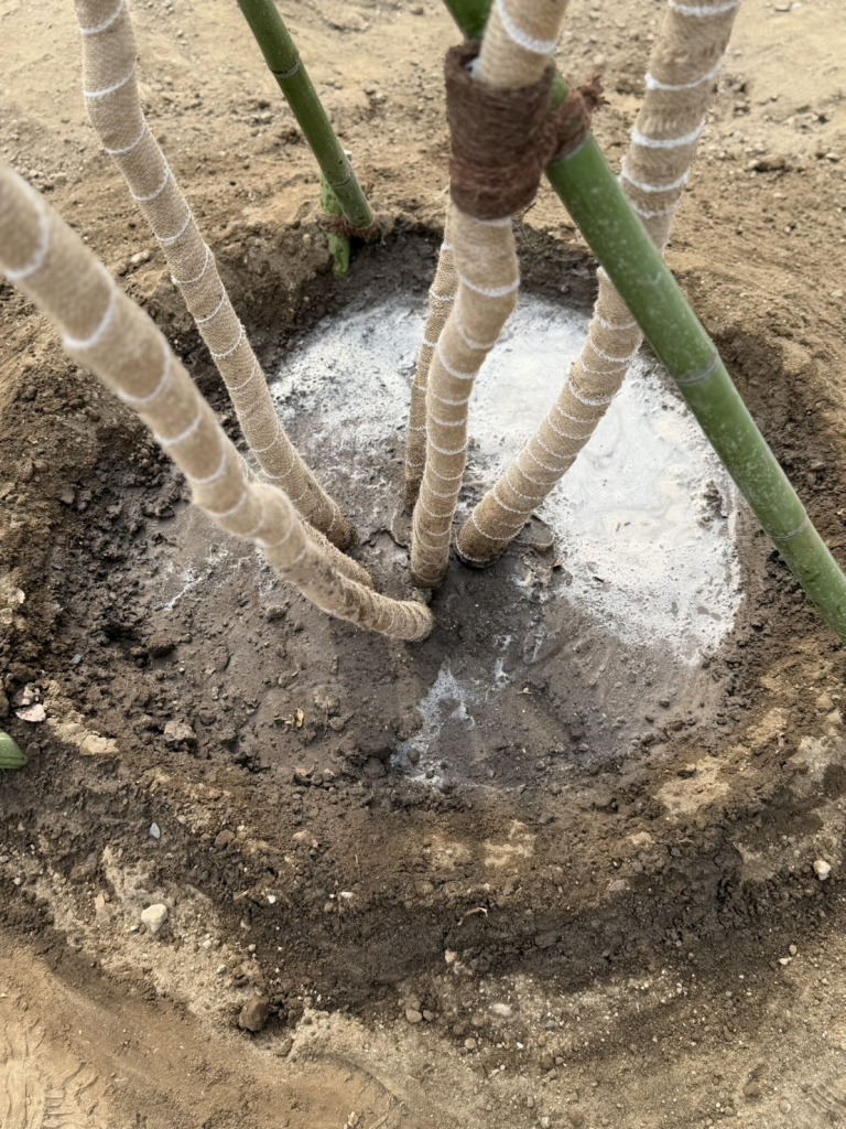 植え付けの際、土と根の隙間に水をたっぷりと送り込み、泥の力で空気を抜いて根を密着させる技法です。棒で突いて土を締め固めるのではなく、水と土の流動性を利用して、優しく、しかし確実に根を落ち着かせます。