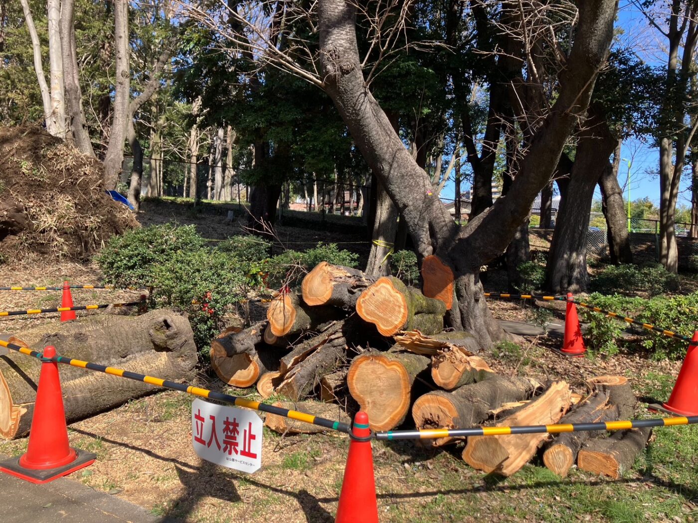 前日のサクラとヒマラヤスギ、樹種は違いますが、どちらも同じ公園で近い時期に、地下部の問題を疑わせる倒れ方をしています。