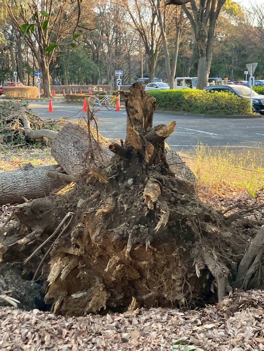 規制帯の外からの目視で確認できた範囲の話ですが、今回の倒れ方は「幹がポキッと折れた」のではなく、根元や根の塊(根鉢)ごとの破壊を伴うものに見えました。