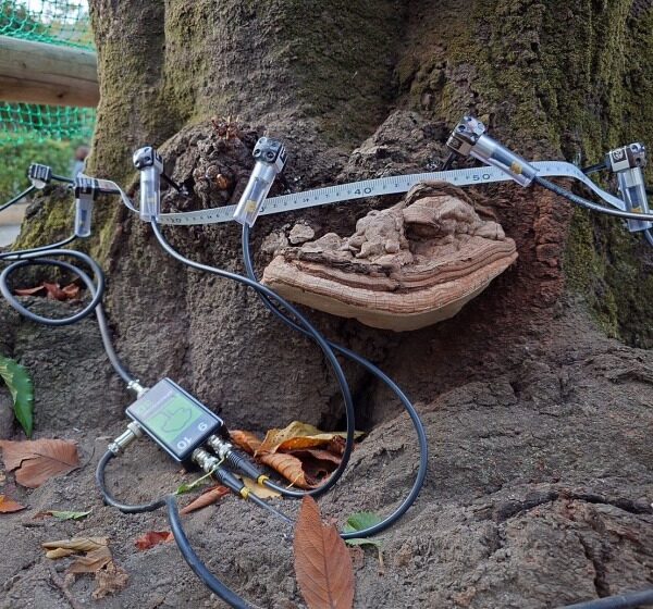 木槌による打診、鋼棒による貫入検査、そしてベッコウタケの子実体が現れやすい初夏から晩秋にかけての適期診断。さらに、レジストグラフやピカス、アーボソニック3Dといった機器診断を組み合わせることで、ようやく樹木の内部(根や幹)の状態に近づくことができます。