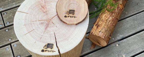 240番の紙ヤスリで仕上げをした後は、森デリバリーの焼印を押して完成です。