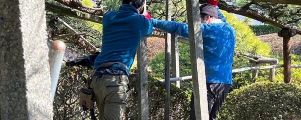 - 寿昌院 臥竜の松 支柱交換 丸太 竹 石柱