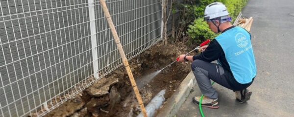 まず樹木の撤去と、既存の土の回収を行い、白紋羽病に適用のある殺菌剤・フロンサイドSCを土壌灌注します。