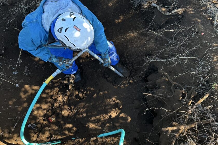 圧縮空気を利用して土壌を吹き飛ばしながら、根を極力傷つけずに露出させています。
